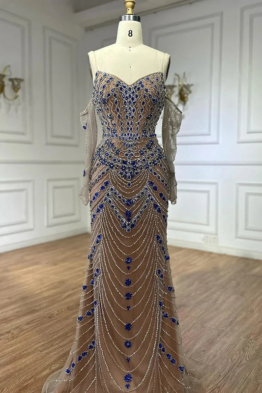 Blue Saudi Arabic Evening Gown Strapless Long Sleeves Beaded Dress For Formal Occasions Birthday Dress Ball Gown