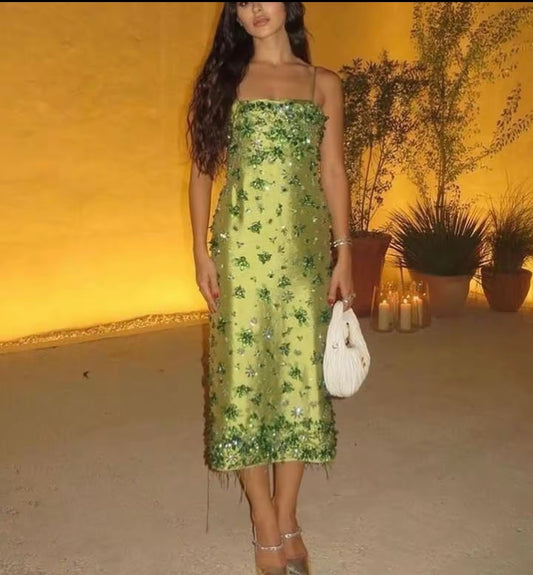 3D Floral Beaded Short Green Evening Dress with Spaghetti Straps Sheath Midi Women Guest of Wedding Bridal Party Ball Gowns
