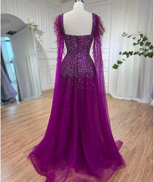 A Line Feathers Cape Sleeves Embellished Luxury Evening Dress Ball Gown Gala Gown For Guest of Wedding 2024