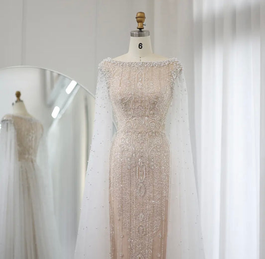 Luxury Pearls Dubai Champagne Mermaid Evening Dresses with Cape Guest of Wedding Gala Gown