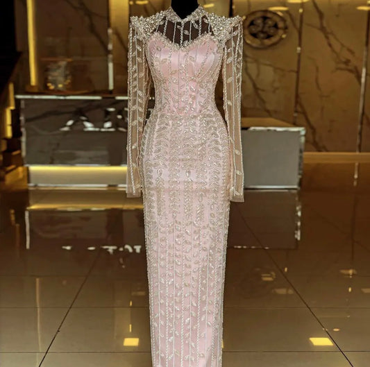 White Embellished Beads and Pearls Evening Dress Women Formal Occasion Dresses Long Sleeve Dubai Celebrity Influencer Dress Fashion