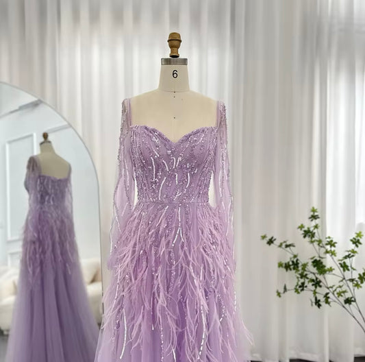 Purple Dubai Lilac Feathers Evening Dresses with Cape Sleeves Long Purple Guest of Wedding Ball Gown