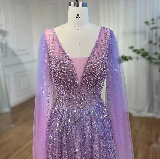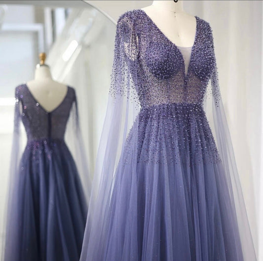 Purple A Line Cape Sleeves V Neck Embellished Long Maxi Evening Ball Gown For Guest Of Wedding