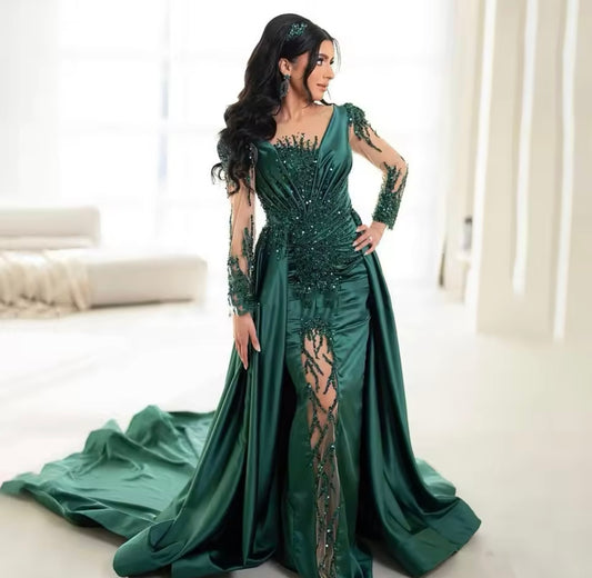 Arabic Green Luxury Beaded Satin Mermaid With Overskirt Evening Dresses 2024 Elegant For Guest of Wedding Gala Gowns Ball Gown