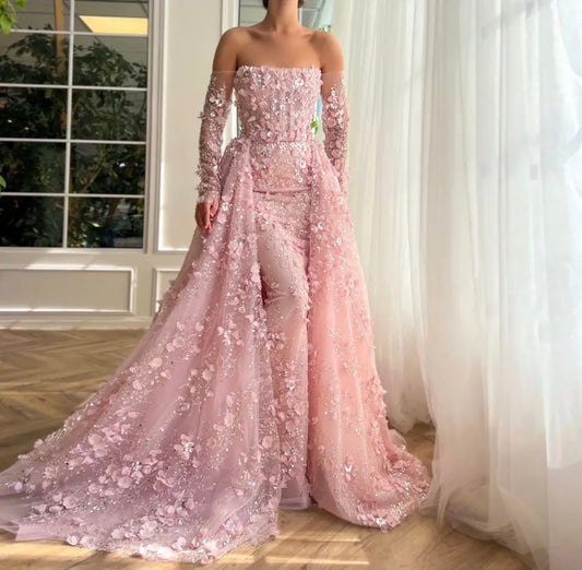 Elegant 3D Flowers Pink Luxury Bridesmaid Evening Dress with Overskirt Lilac Long Sleeves Women Guest of Wedding Gown