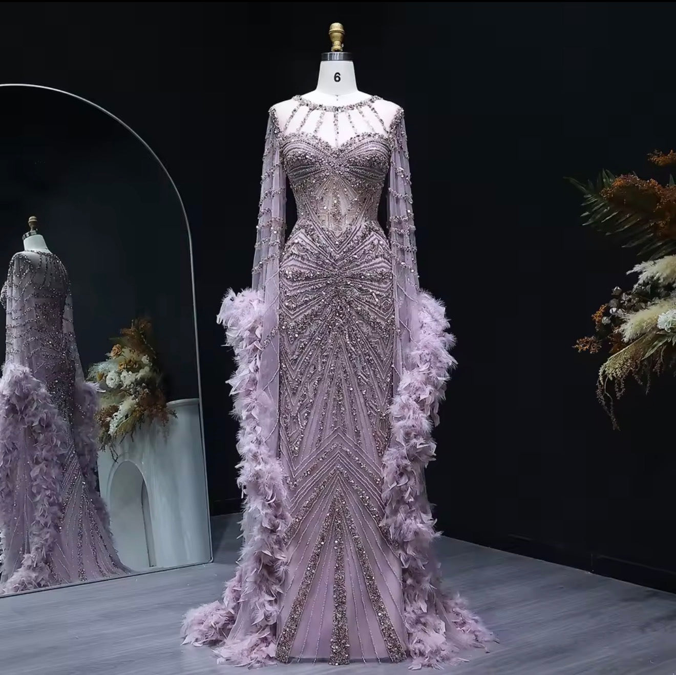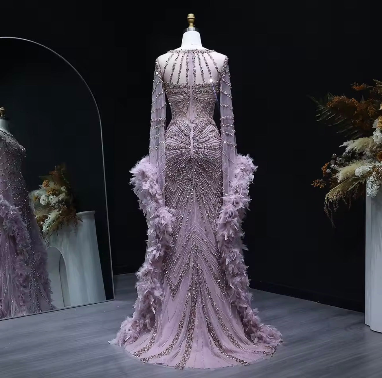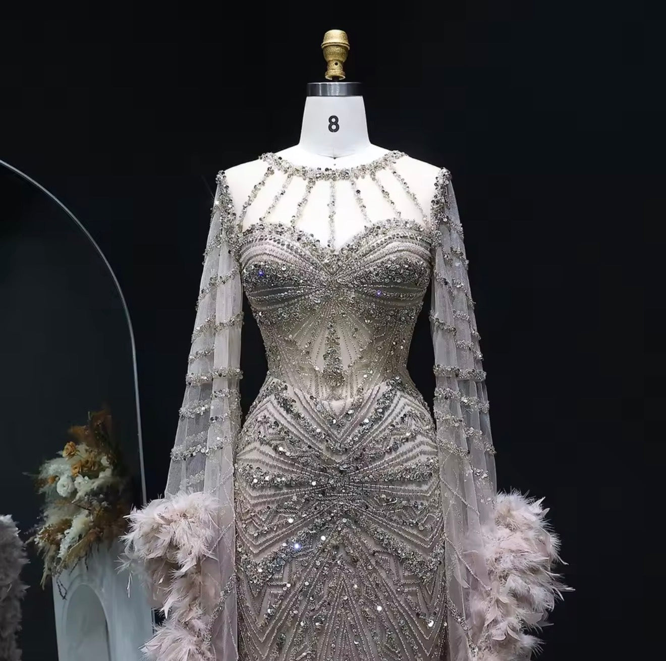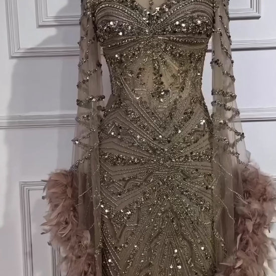 Embellished Mermaid Evening Dress with Feather Cuffs for Formal Occasion Wedding Guest Gala Ball Gown