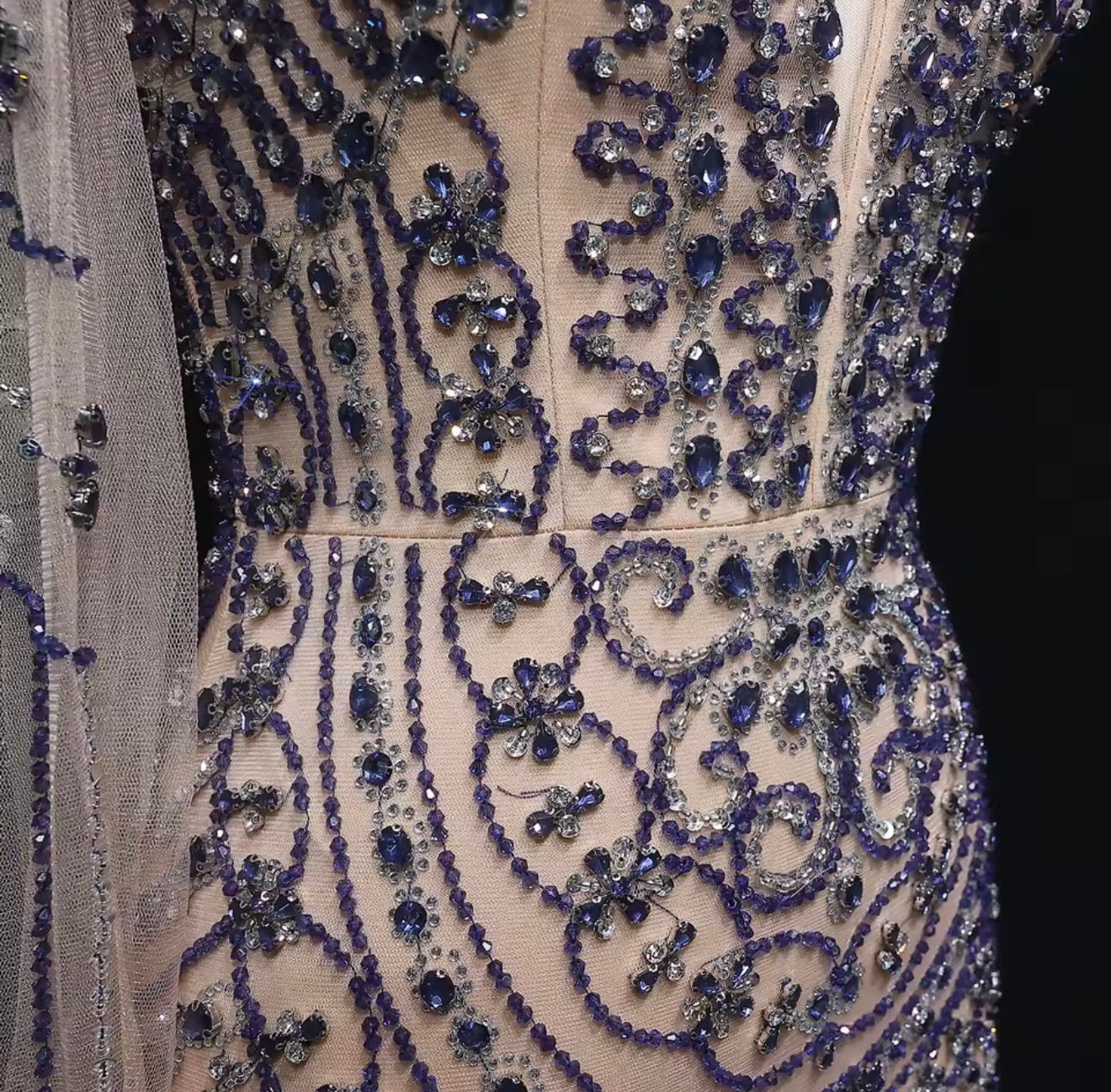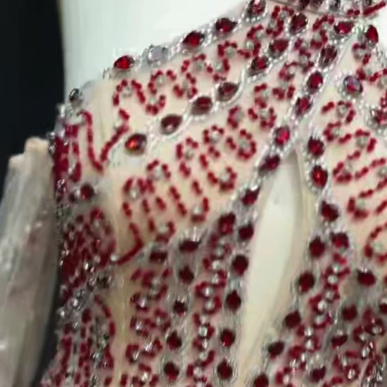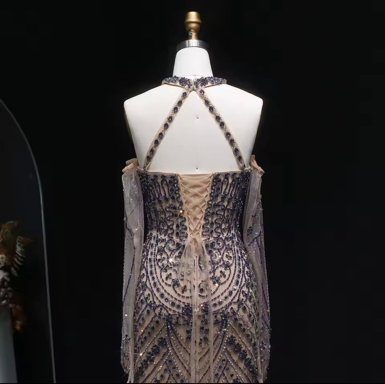 Elevate your evening look with this customized evening dress. Embellished with luxurious beads and featuring a stylish feather detail, halter dress with open back, this dress is perfect for weddings and special events. Make a glamorous entrance and stand out in this elegant and sophisticated gown.