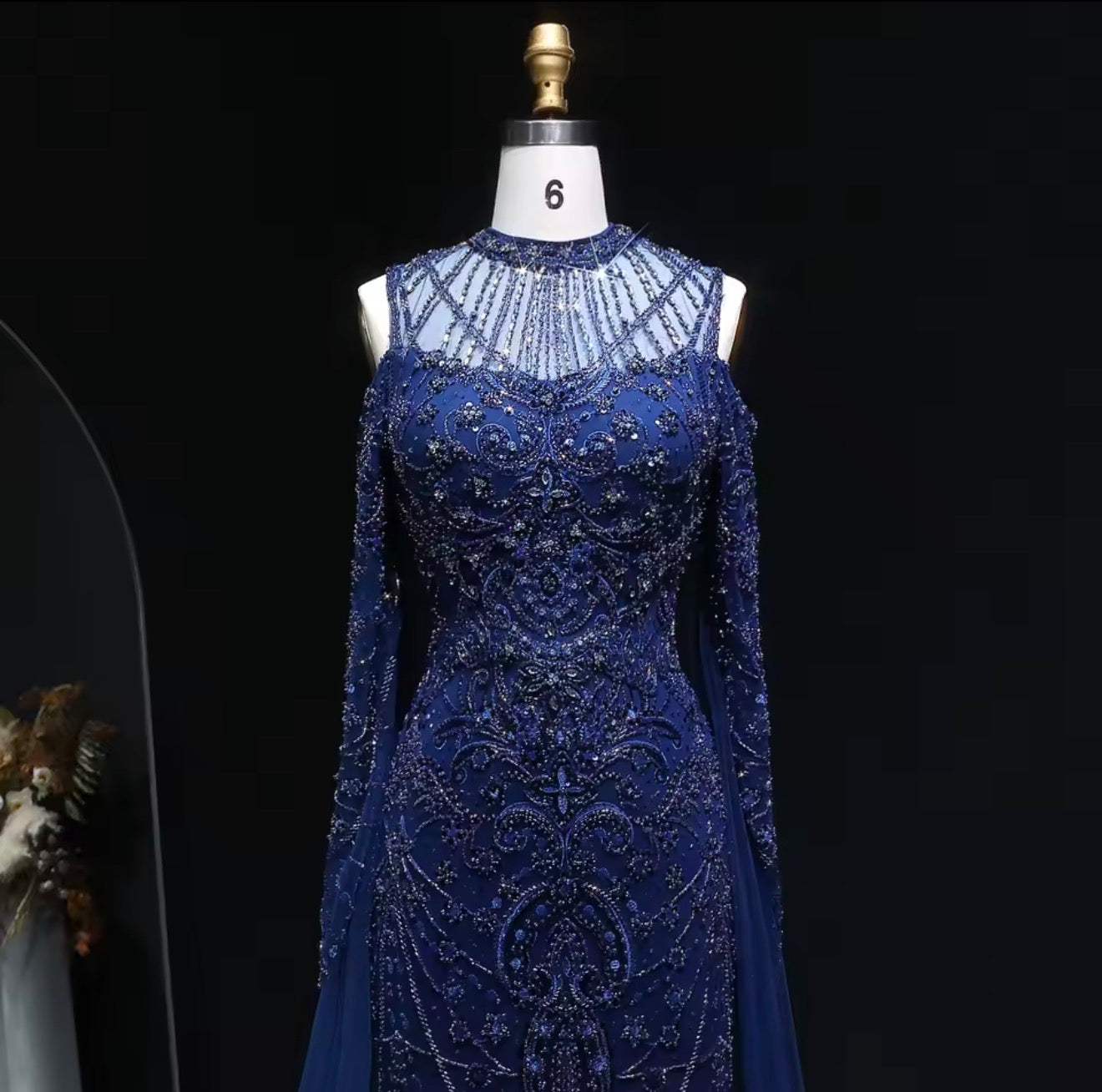 Luxury Navy Blue Off Shoulder Mermaid Evening Dress Long Sleeve Guest of Wedding Gala Gown Ball Gown